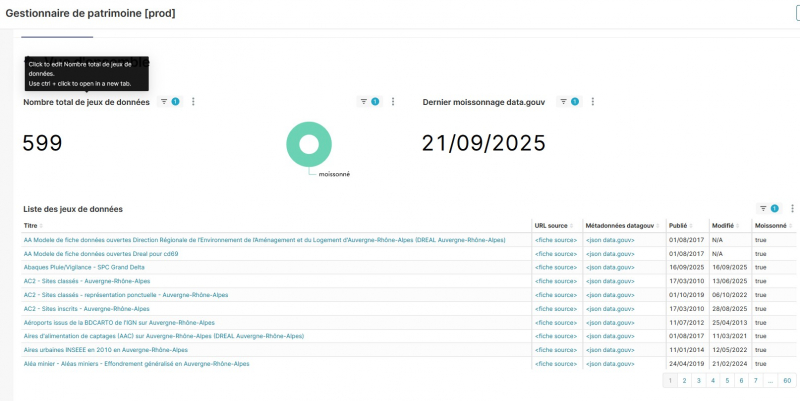 Ce tableau de bord permet de visualiser le patrimoine d'une organisation moissonnée par data.gouv.fr.